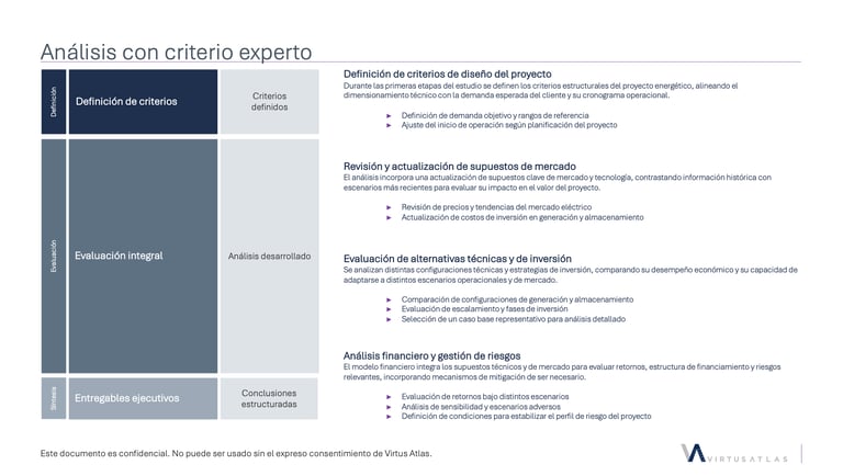 Abordamos cada proyecto energético como un problema de negocio concreto, integrando análisis técnico, modelación financiera y criterio estratégico, con un foco claro: reducir incertidumbre y apoyar decisiones de inversión bien fundadas.